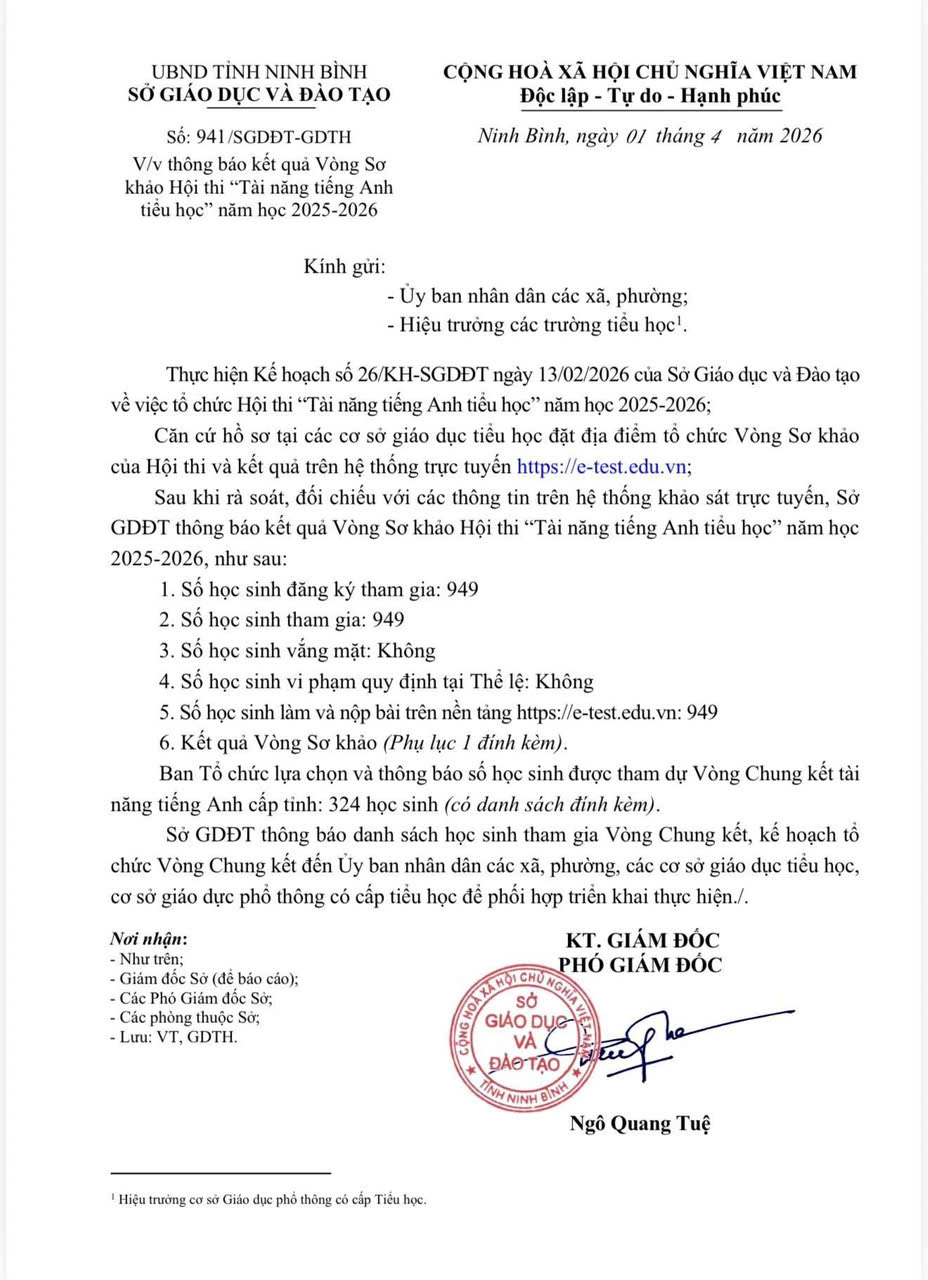 Xin chúc mừng em Dương Thị Kim Ngân – học sinh lớp 5, Trường Tiểu học Tam Thanh đã xuất sắc lọt Top 324/949 học sinh tham gia Vòng Sơ khảo cuộc thi “Tài năng tiếng Anh tiểu học” năm học 2025-2026.