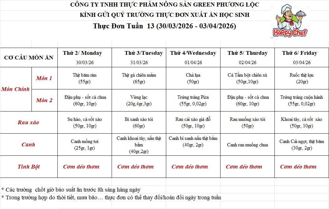 Thực đơn tuần 13 (30/03/2026 – 03/04/2026)